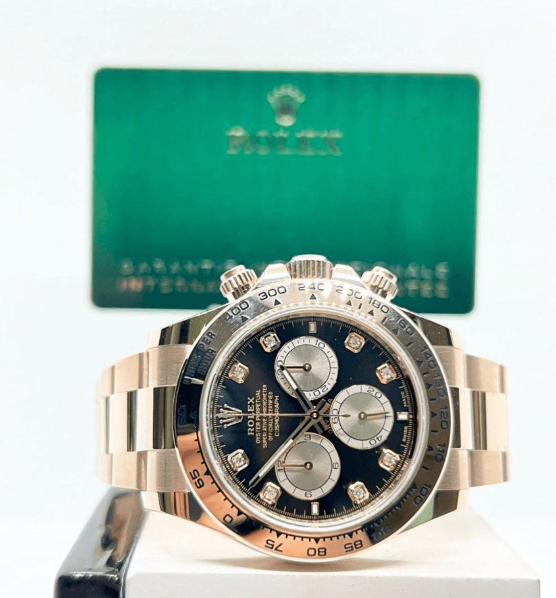 Model : 126505 Also known as : Oyster Daytona Chronograph Case size : 40mm Dial : Black Dial With 8PT Diamond Baton Numerals Index & Sub Chrono Dials Case metal : 18ct Everose Rose Gold Clasp/ Buckle Type : 18ct Everose Rose Gold Folding Clasp Case back : Solid Bezel : 18ct Everose Rose Gold Strap/Bracelet : 18ct Everose Rose Gold Oyster Bracelet Movement type : Automatic Water resistance : 100m Crystal : Sapphire Series : AN Dated : August 2024 Original Box : Yes Original Card / Papers : Yes ( NFC Card )